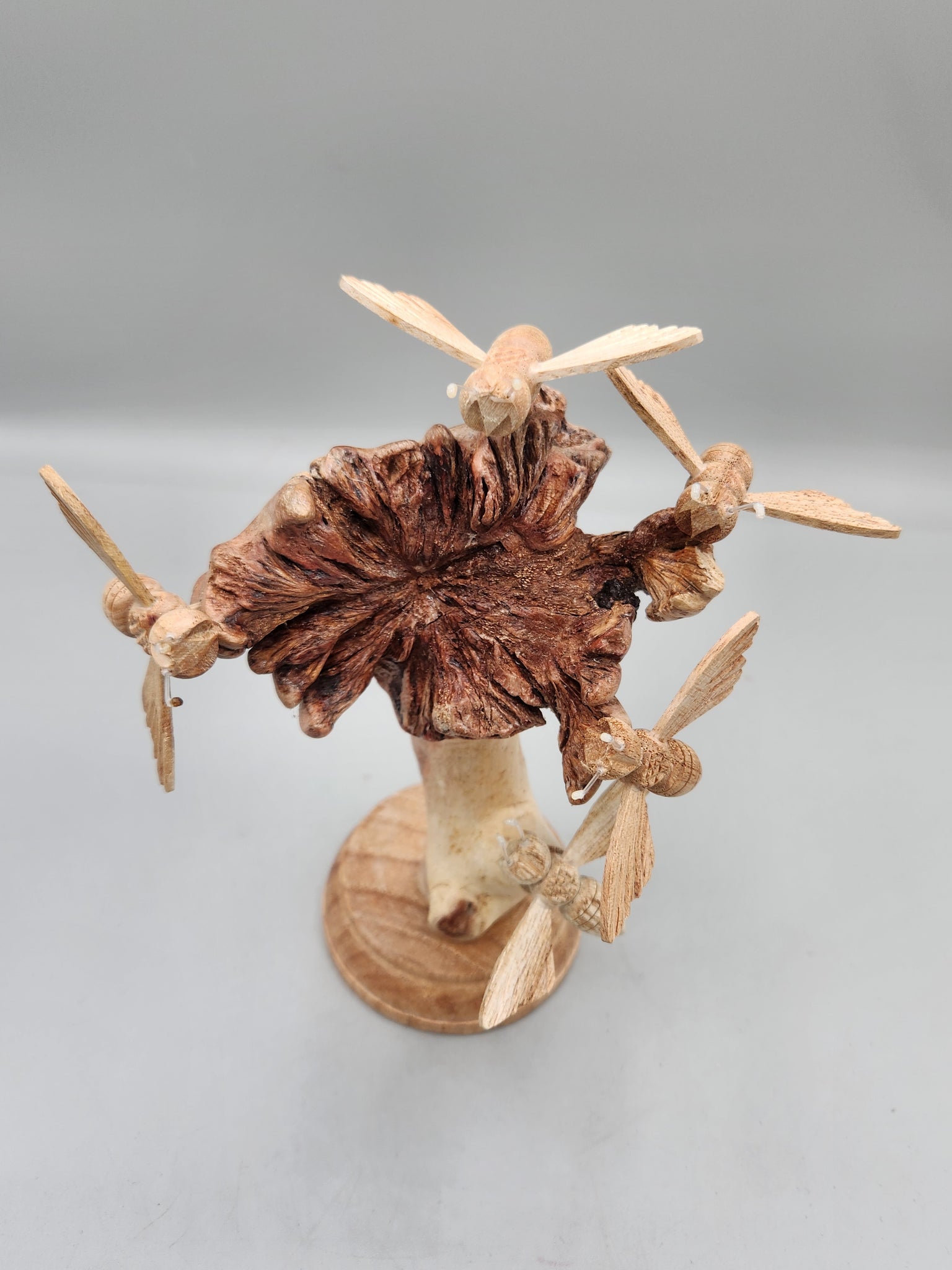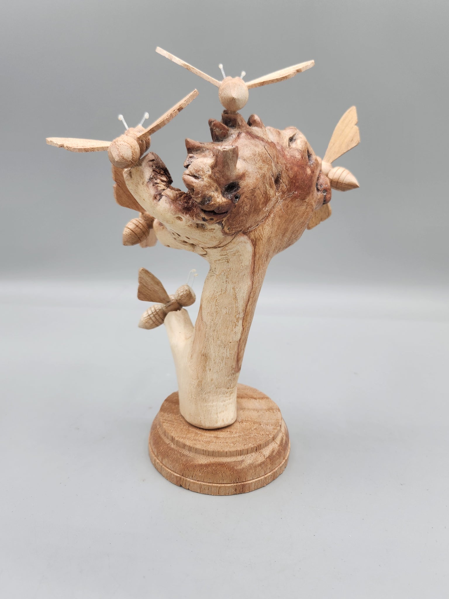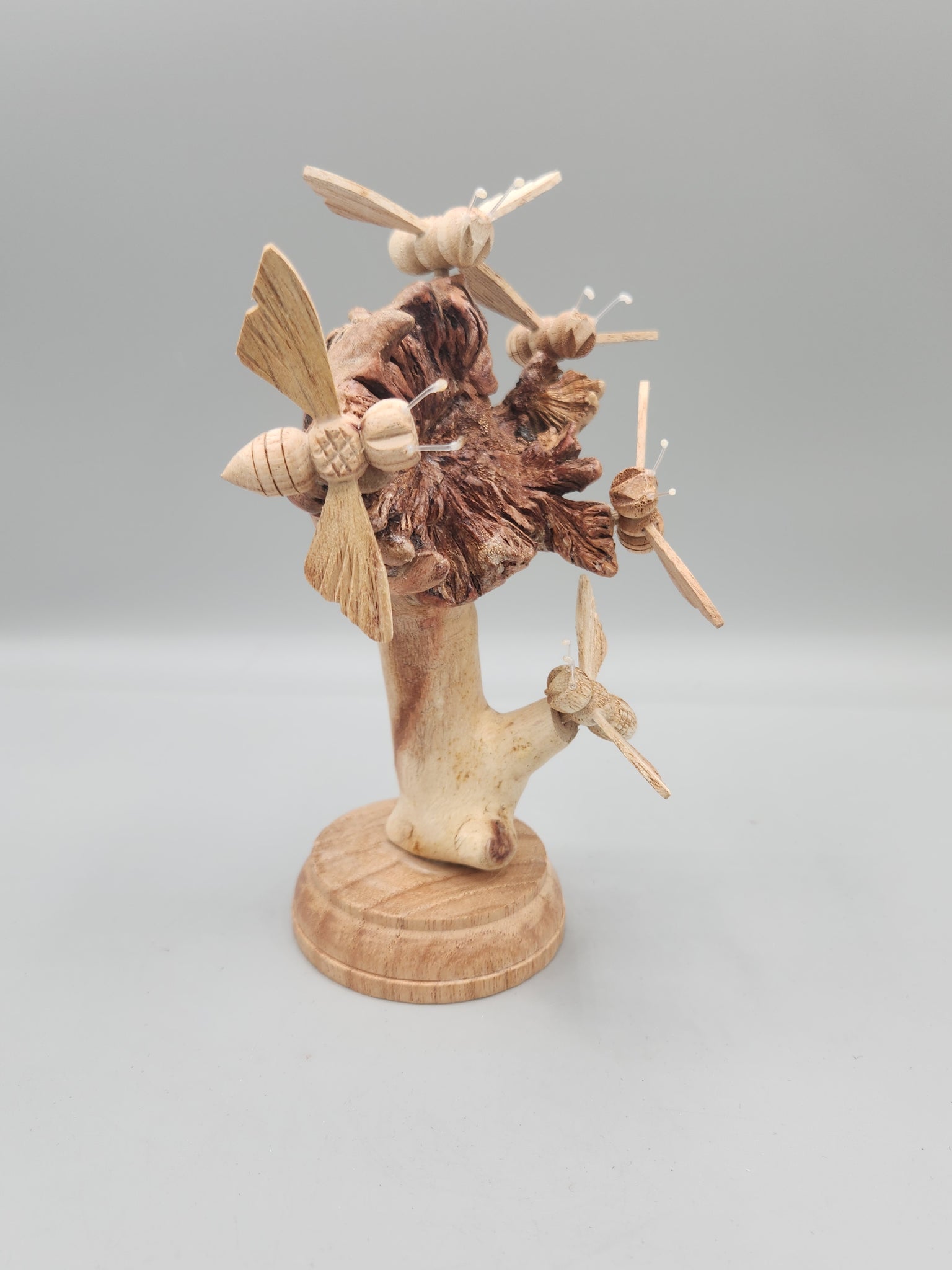 Solid Wood Mushroom Stand surrounded by 5 Bees.