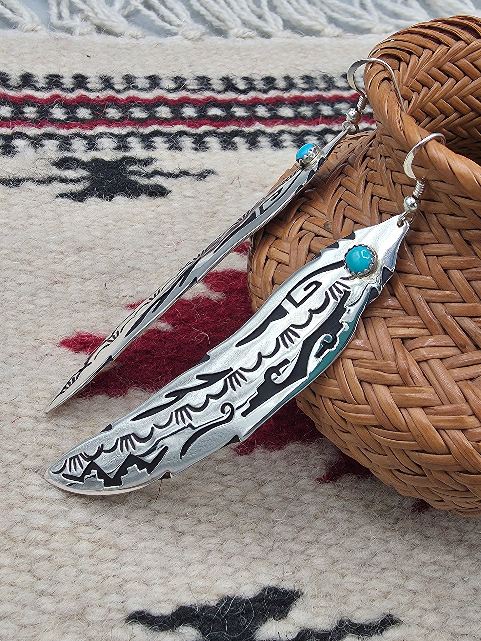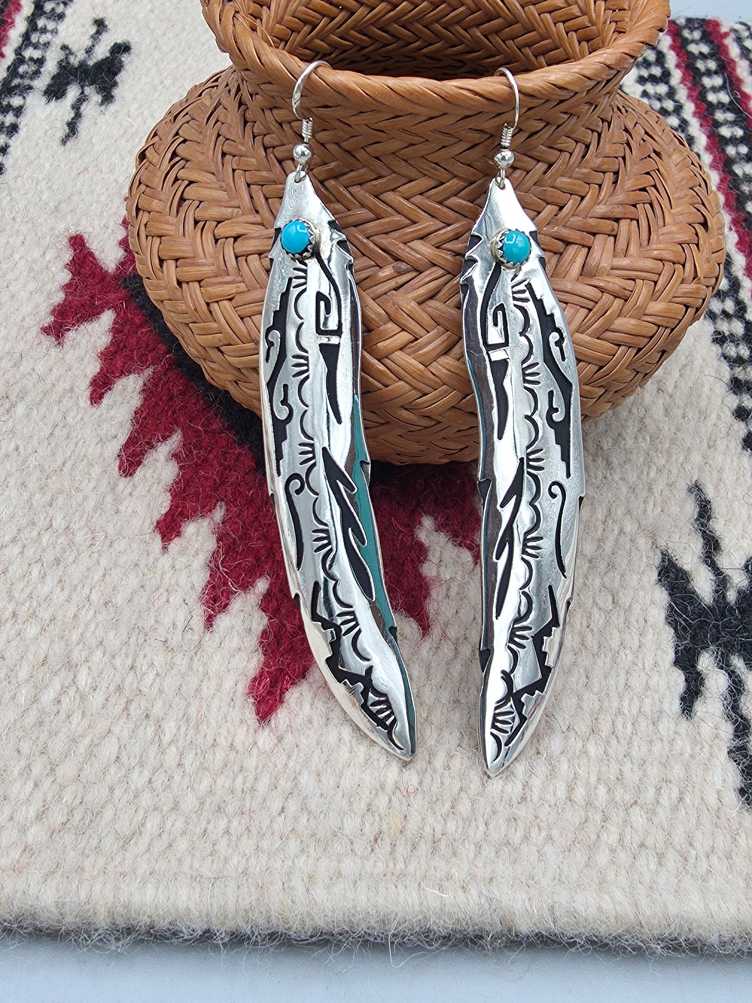 Beautiful Sterling Silver Extra Long Turquoise Overlay Feather Earrings by Navajo Silversmith Tommy & Rosita Singer.