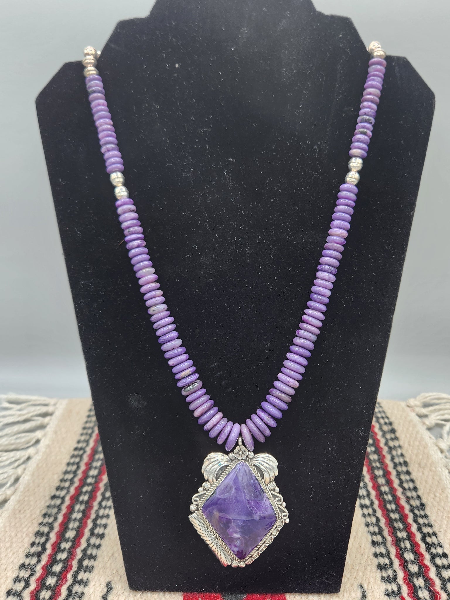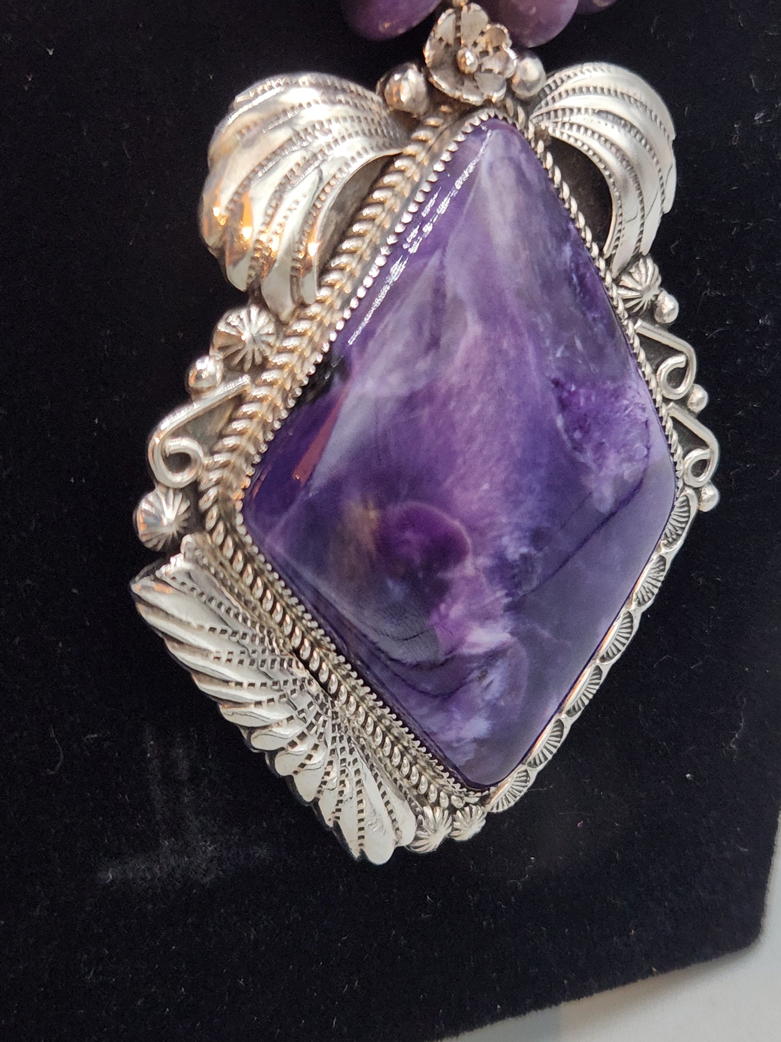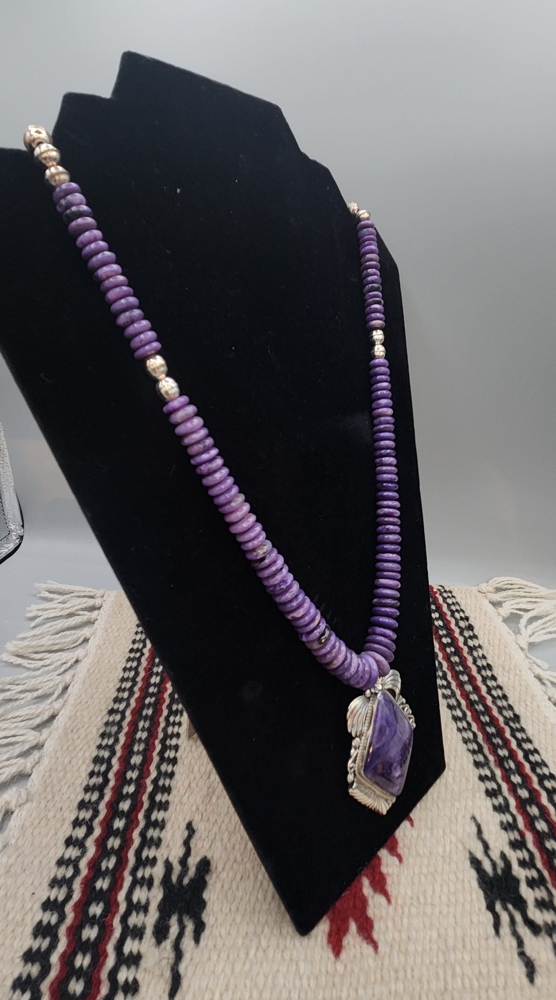 Absolutely STUNNING Charoite Pendant on Charoite Rondelle Graduated Beads plus Sterling Silver Bench Beads with Cones & Lobster Claw Clasp. Navajo HANDCRAFTED with painstaking details.