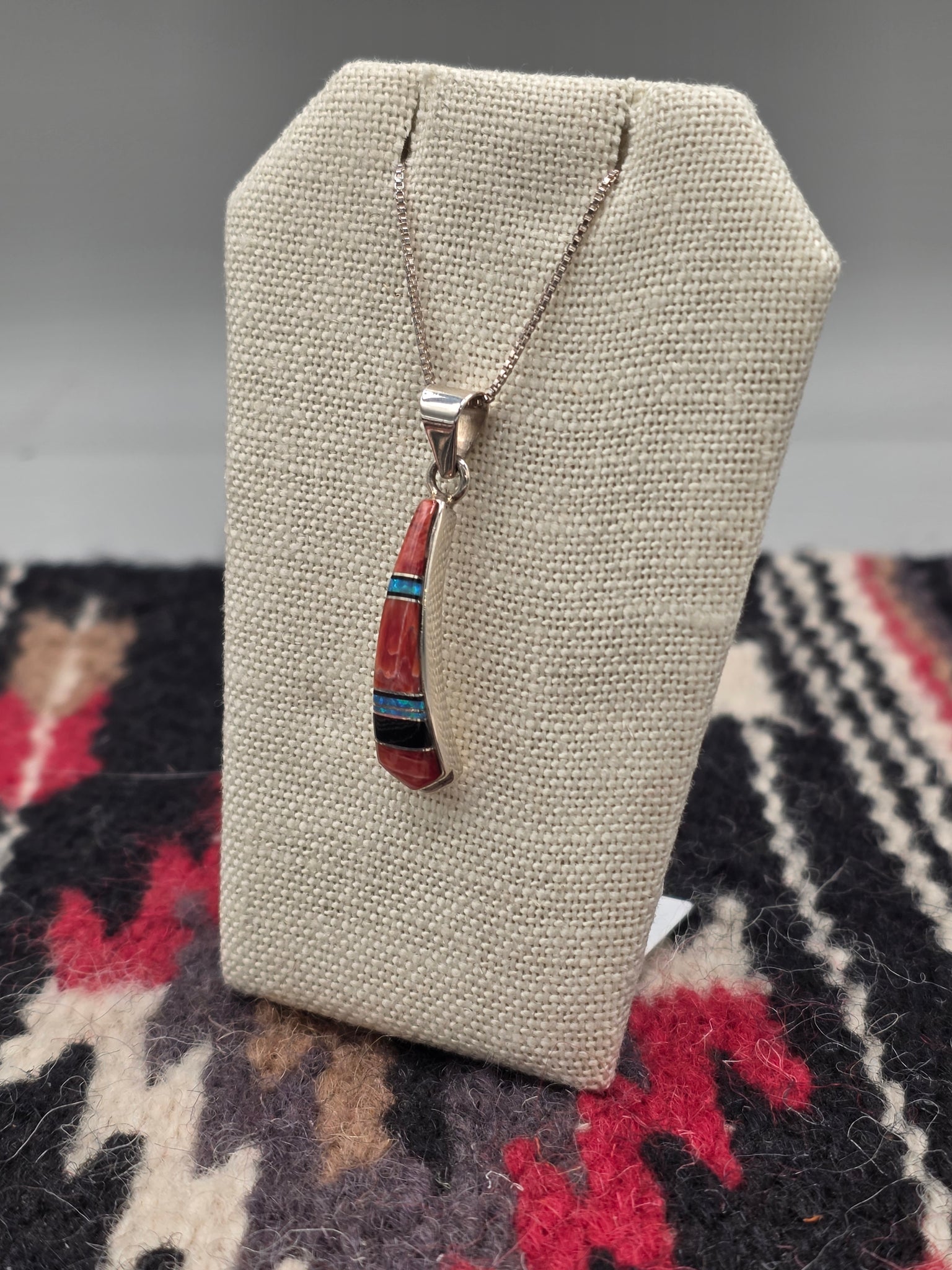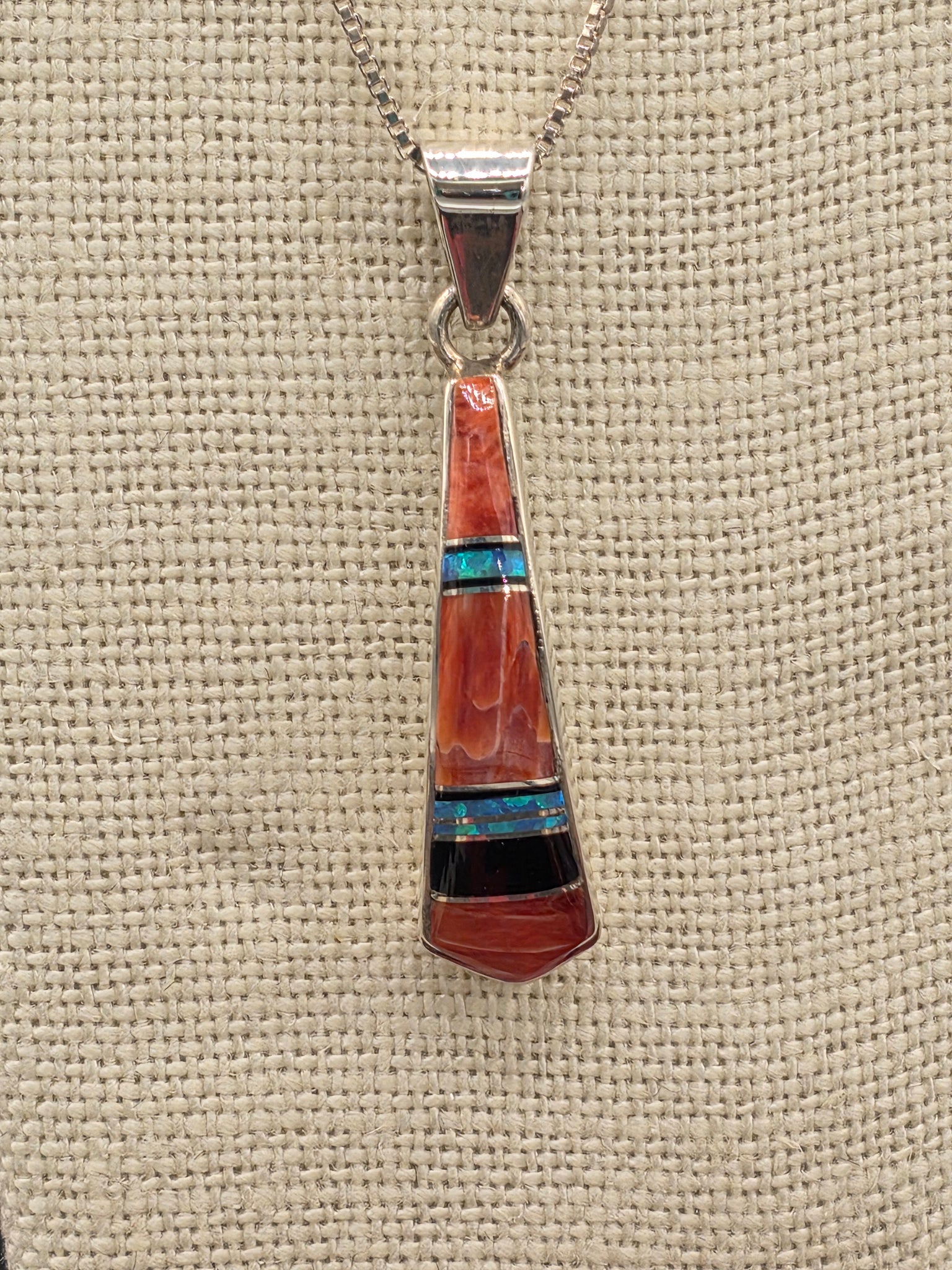 HANDCRAFTED Spiny Oyster Shell with White Opal & Jet INLAY PENDANT ON 16" BOX CHAIN. DESIGN BY BG MUDD IN NEW MEXICO BY ZUNI SILVERSMITHS.