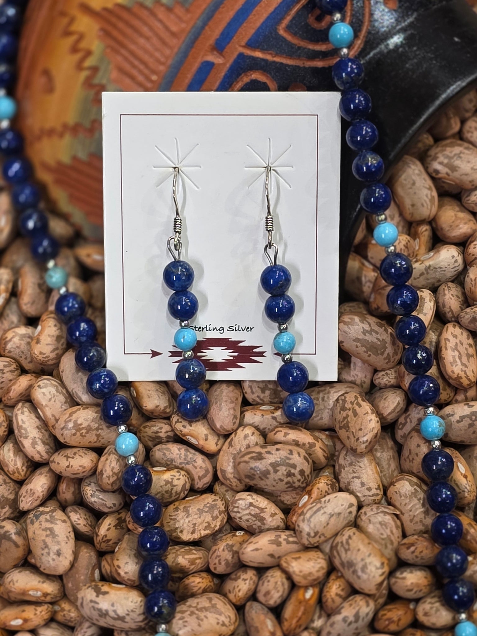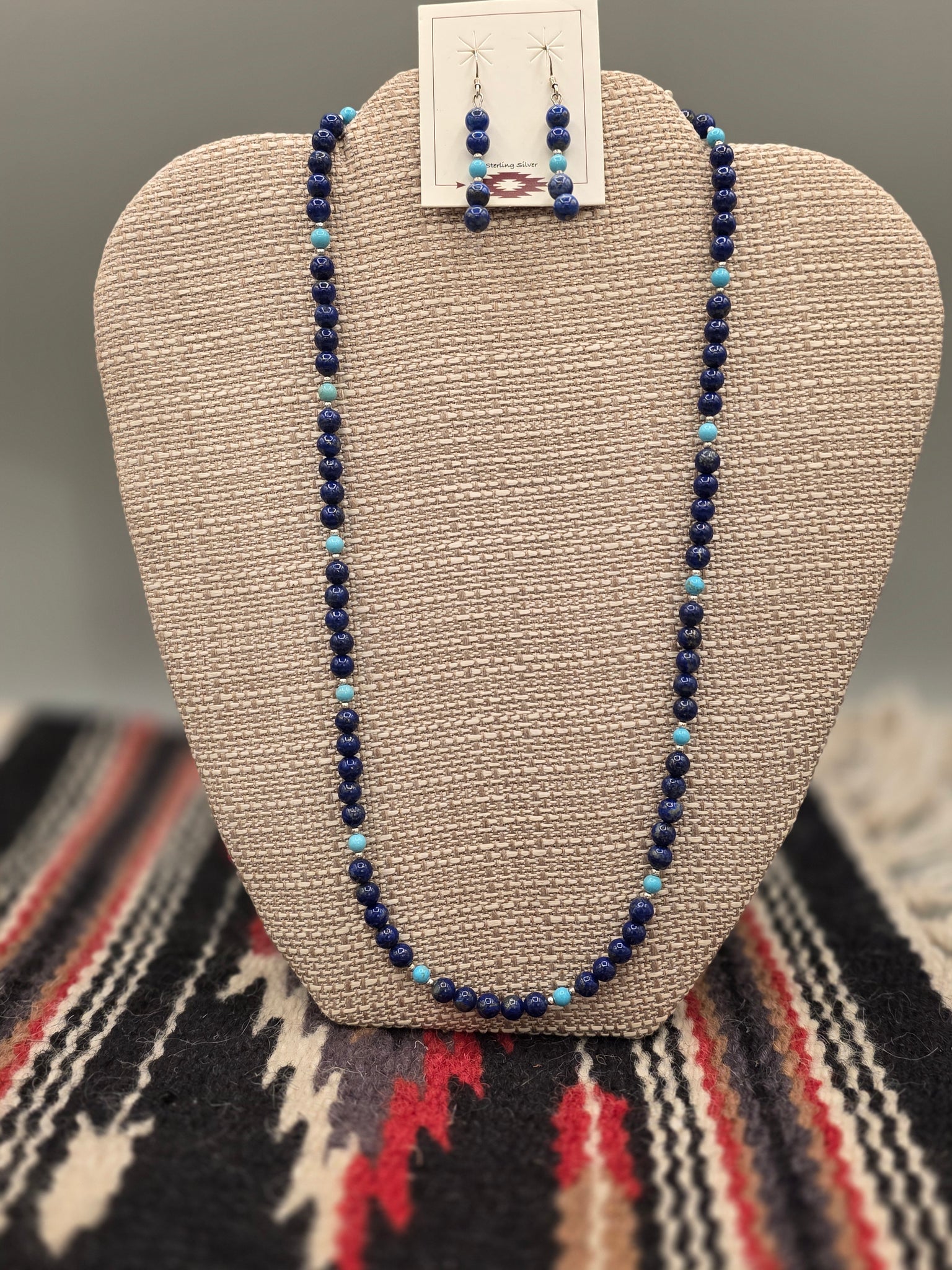 Lovely Delicate 6 mm Lapis Lazuli & Turquoise Beaded Necklace & Earrings Set with Sterling Silver. 2 mm spacer beads. 20" long with Lobster Claw.