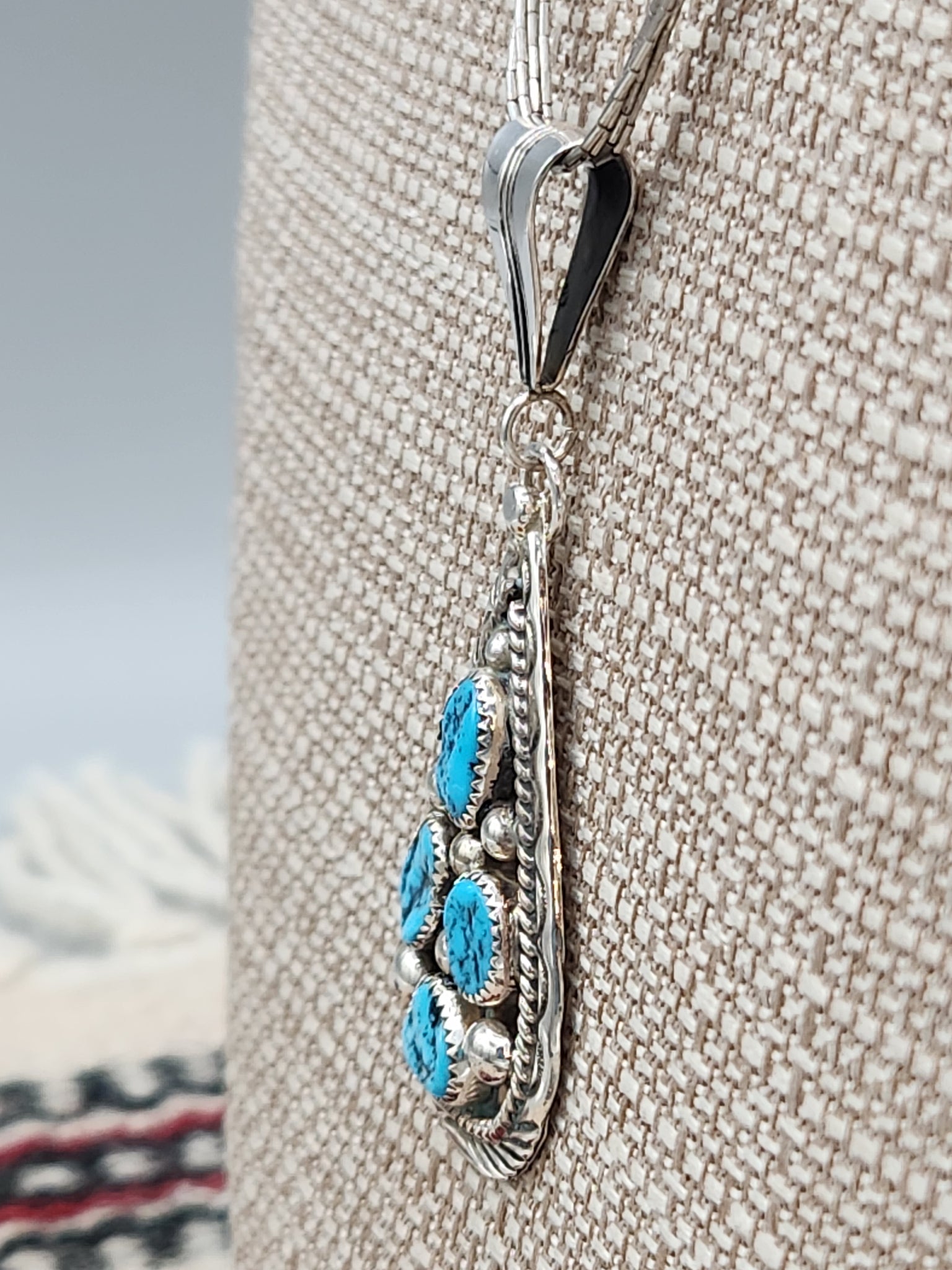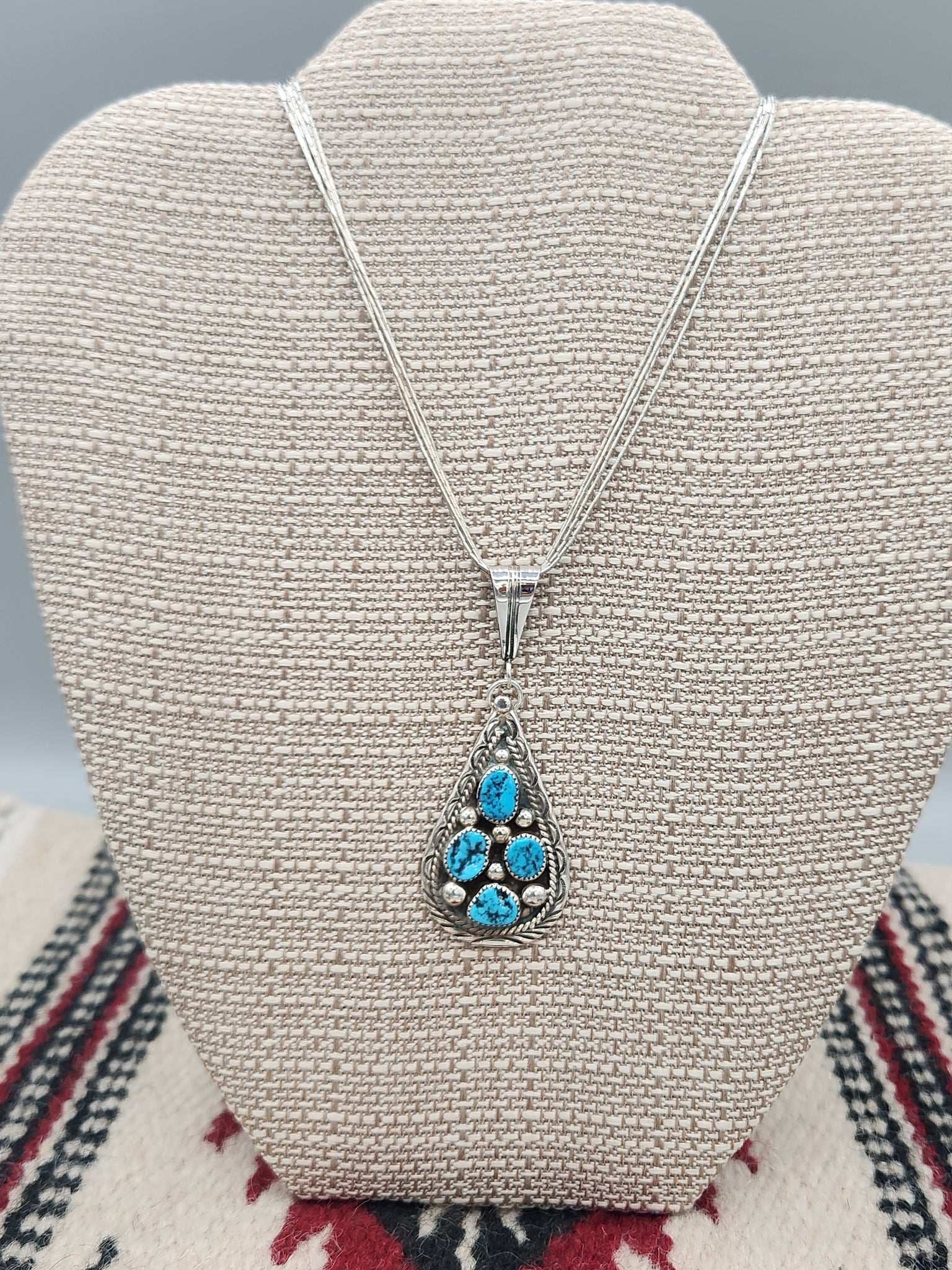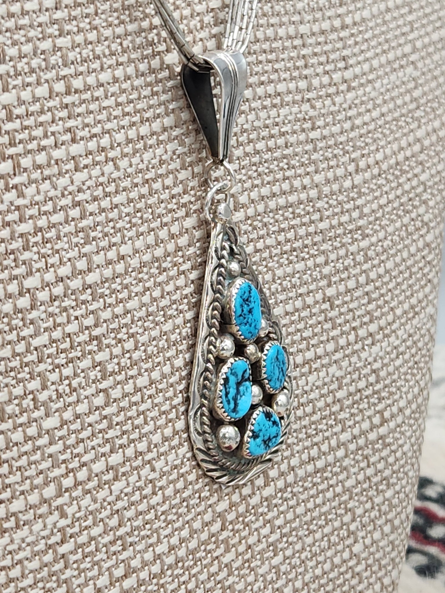 Beautiful Traditional 4 Stone Turquoise Teardrop Shaped Pendant on Liquid Silver Chain.