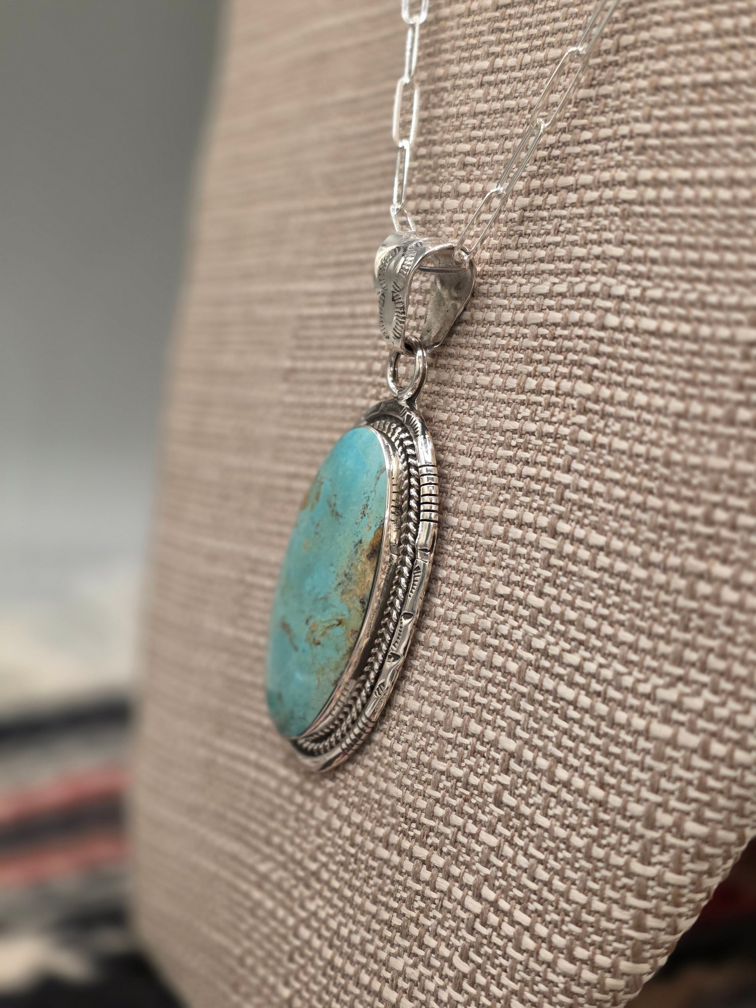 Large Navajo Handcrafted OVAL Turquoise Pendant set in Sterling Silver by Mike Smith with large Bail.