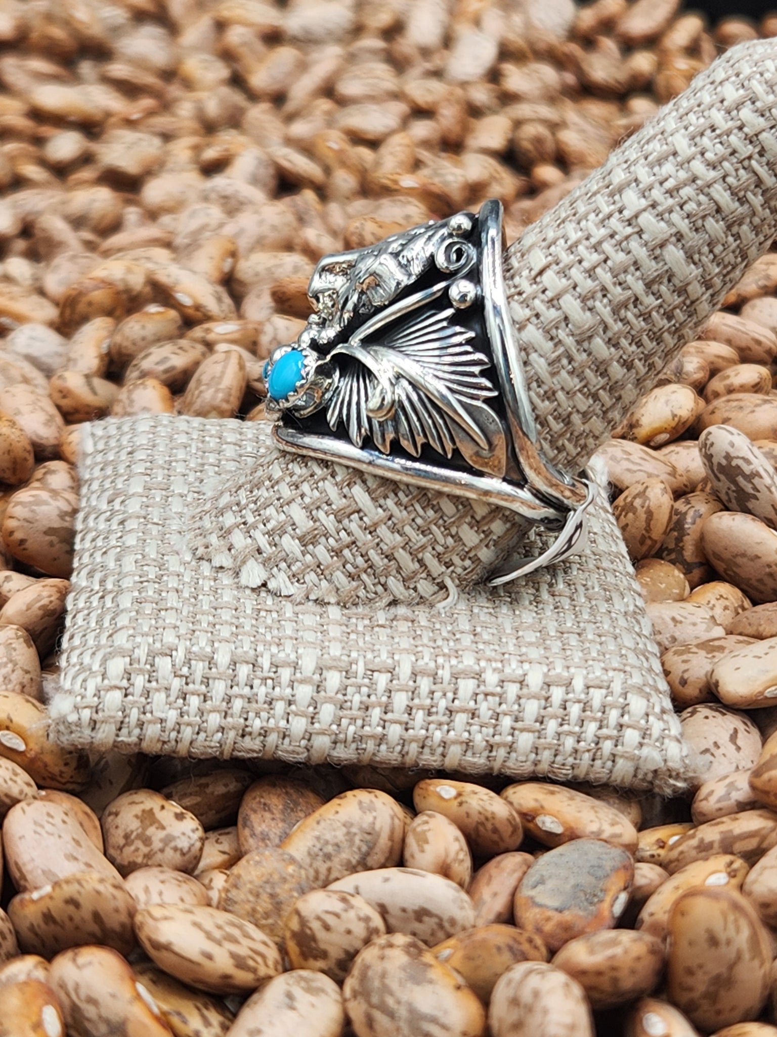 Large, Wide Sterling Silver 2 Stone Turquoise Ring with Bear Face Design. Available in size 10 & 12. We can resize up or down 1 full size.