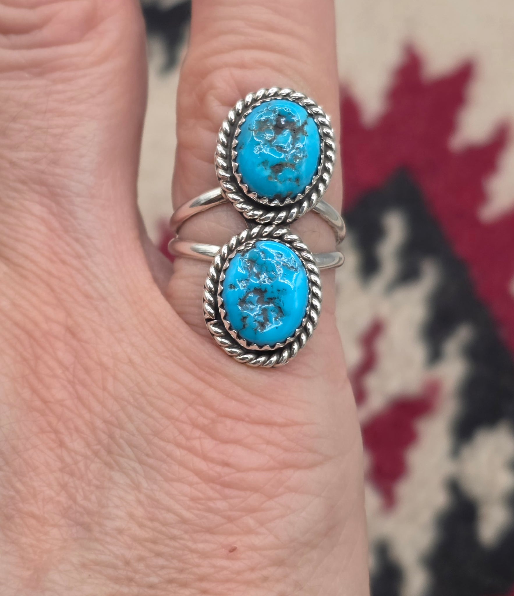 Two Stone Split Shank Turquoise Ring set in Sterling Silver. Navajo HANDCRAFTED by Annie Spencer. Approximately 30 mm long. 13 mm wide.