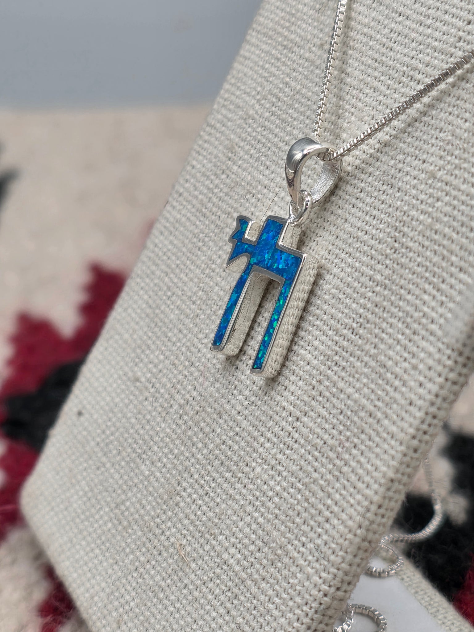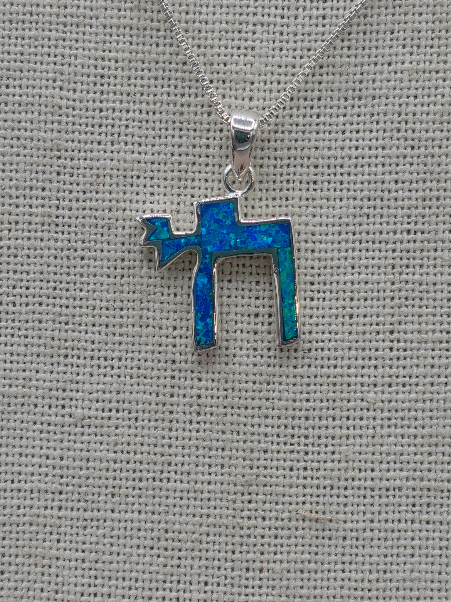 Blue Opal Chai Necklace set in Sterling Silver. Includes a Sterling Silver #015 Box Chain 18" long. Pendant is approximately 23 mm long. 16 mm wide.