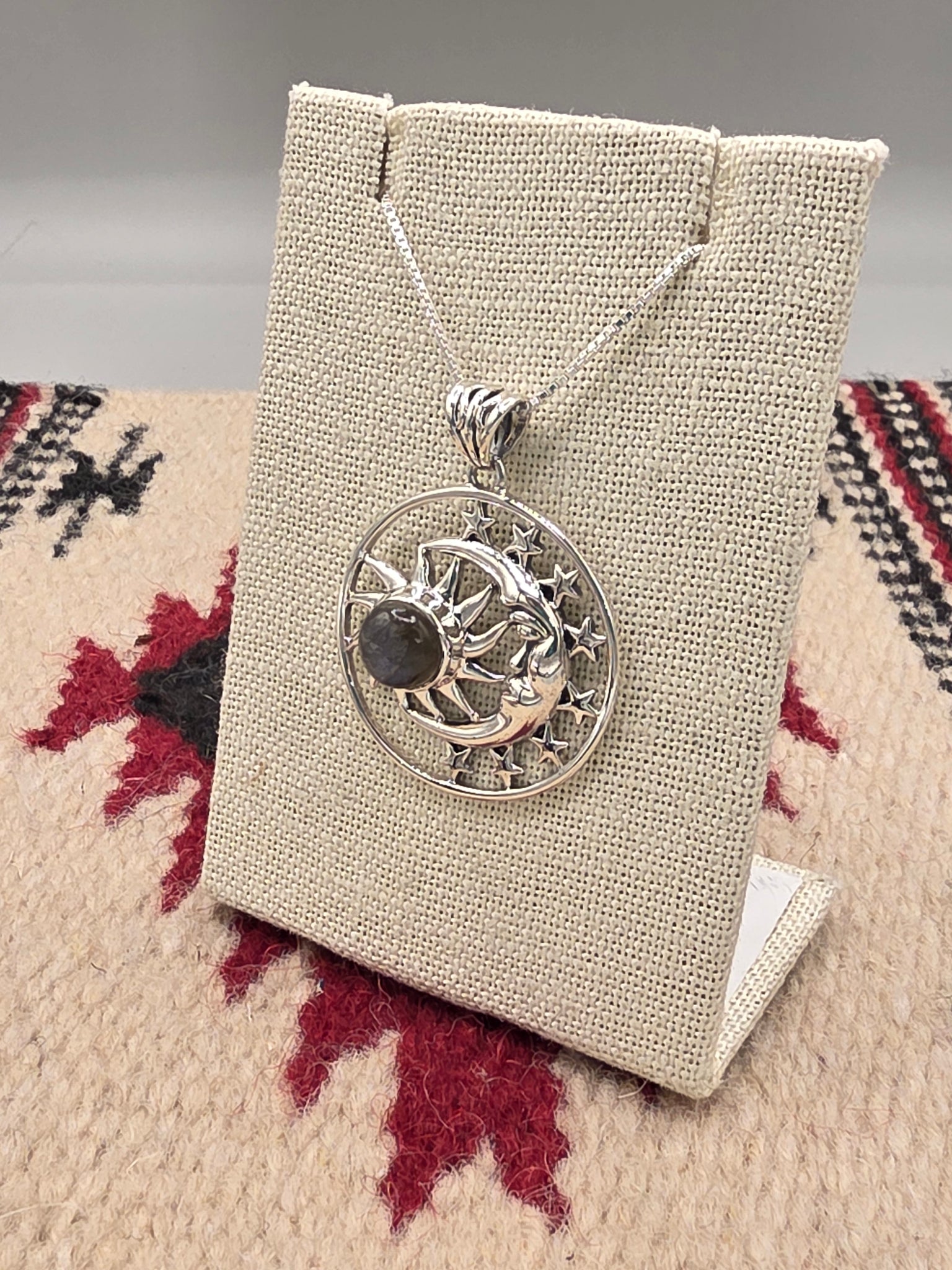 Sterling Silver LABRADORITE Pendant featuring Sun, Crescent Moon & Stars in Circle. Includes a 20" long Sterling Silver #019 Box Chain.