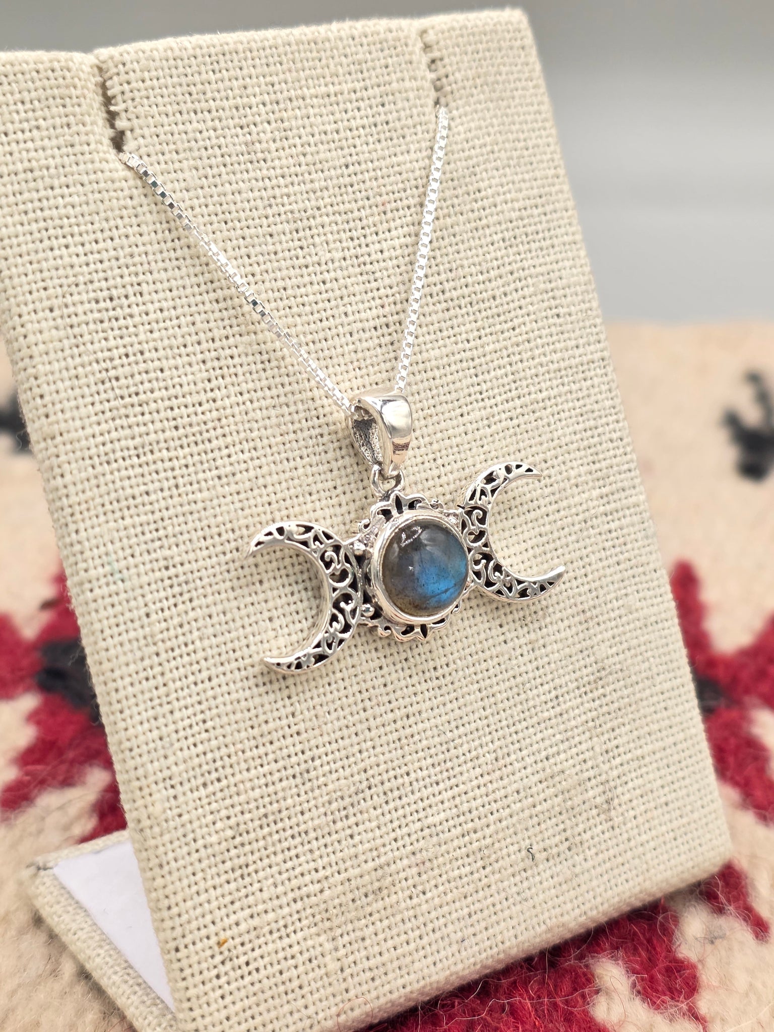 Sterling Silver Labradorite Triple Moon Pendant with center stone. Includes a 20" Sterling Silver #019 Box Chain.