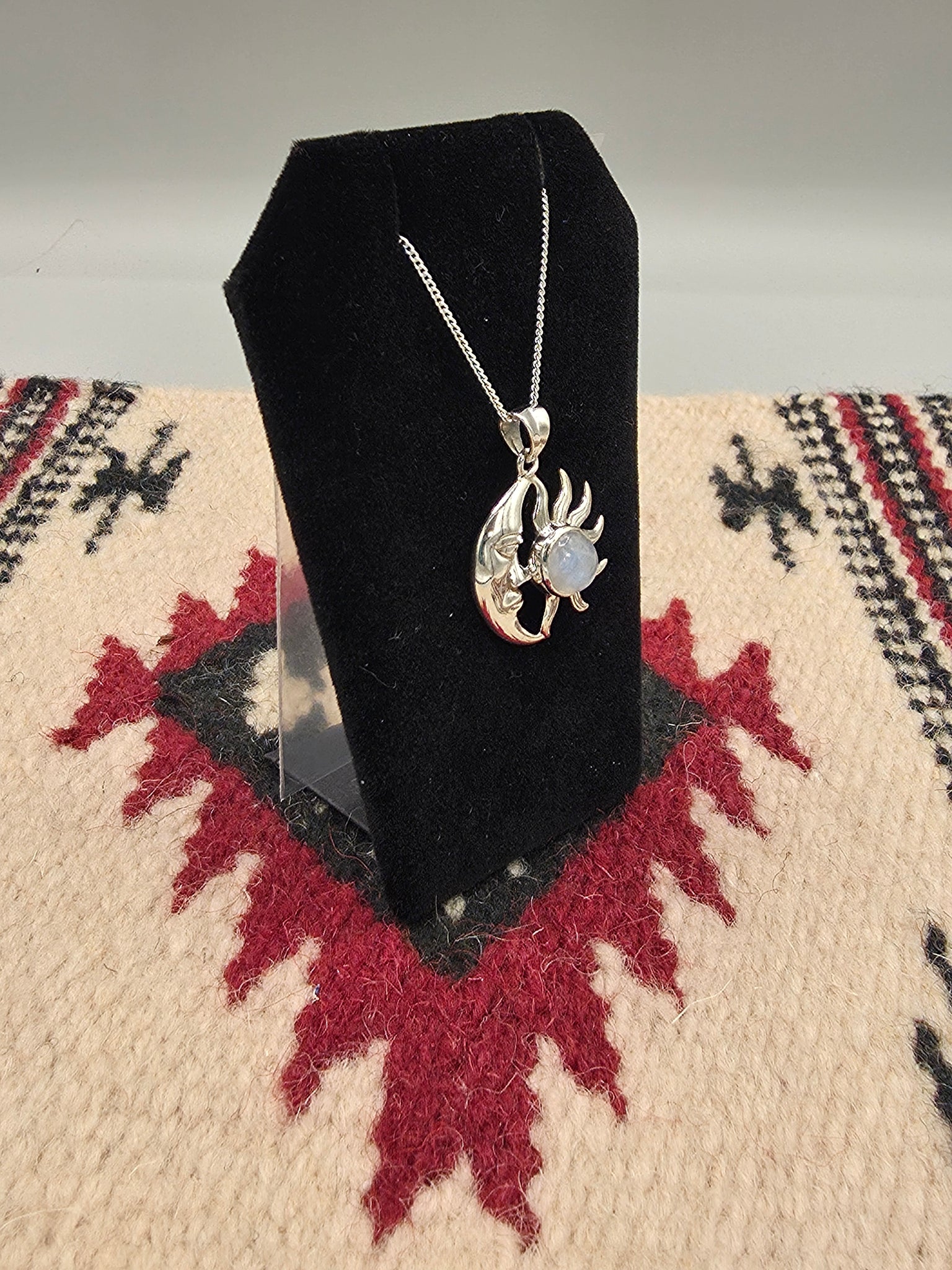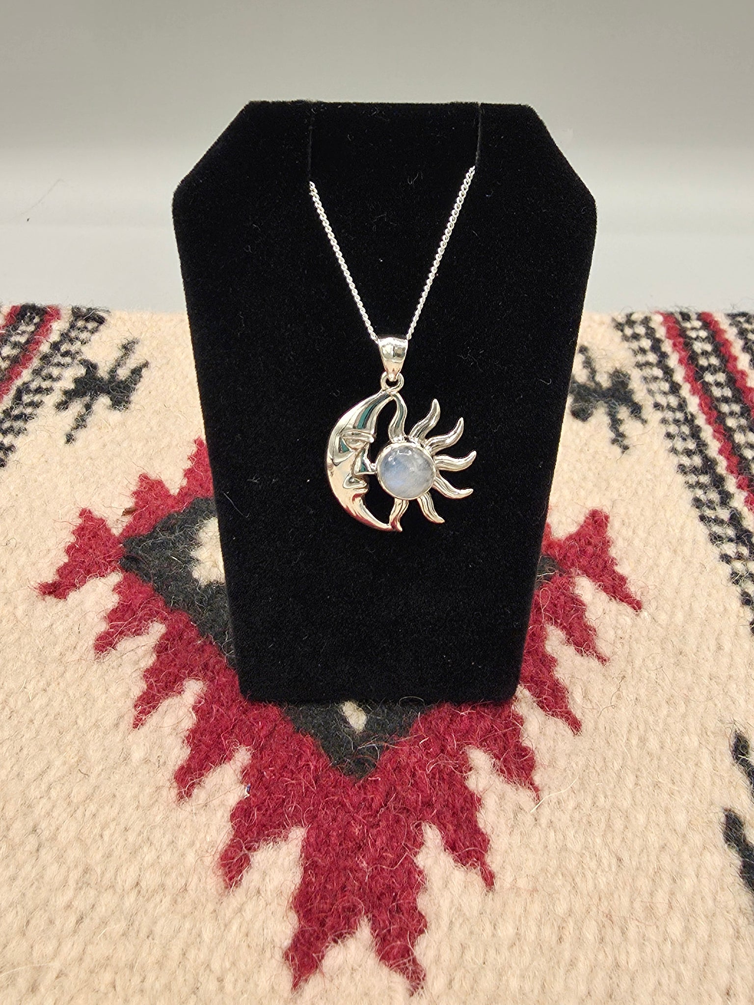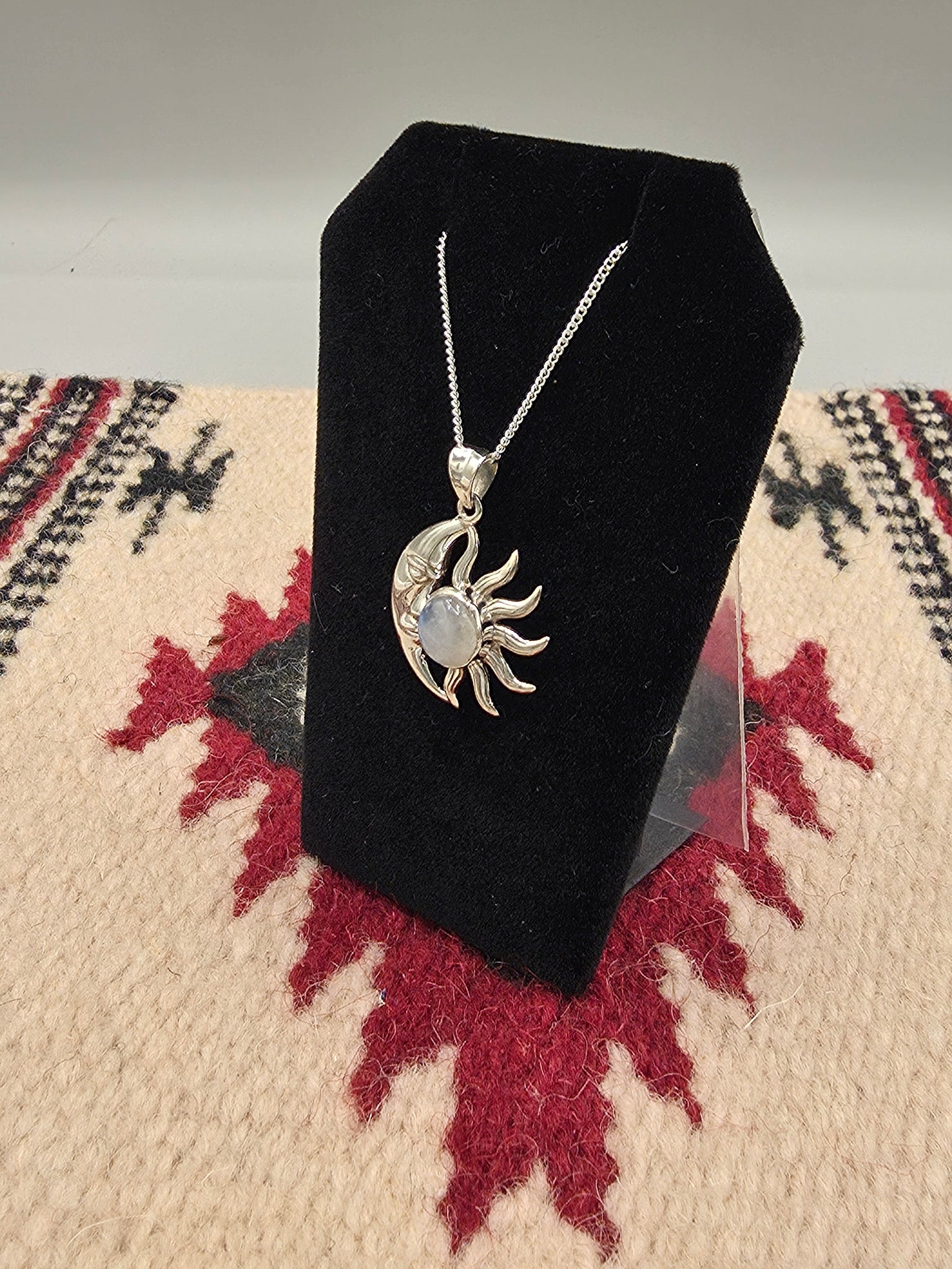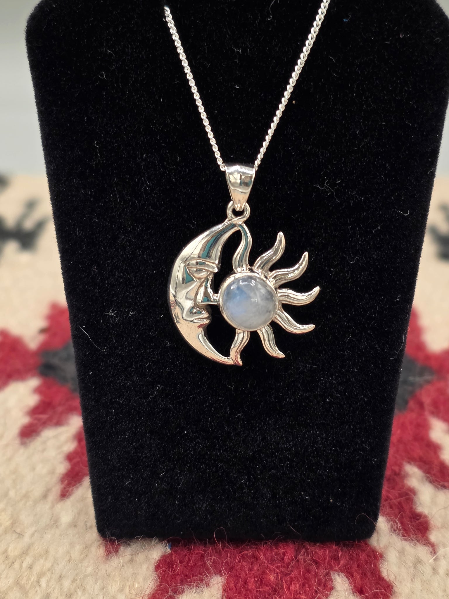 Sterling Silver Moonstone Pendant with Crescent Moon & Sun design. Includes a Sterling Silver 18" #015 Box Chain.