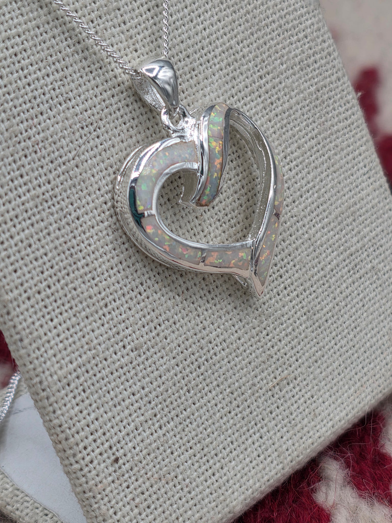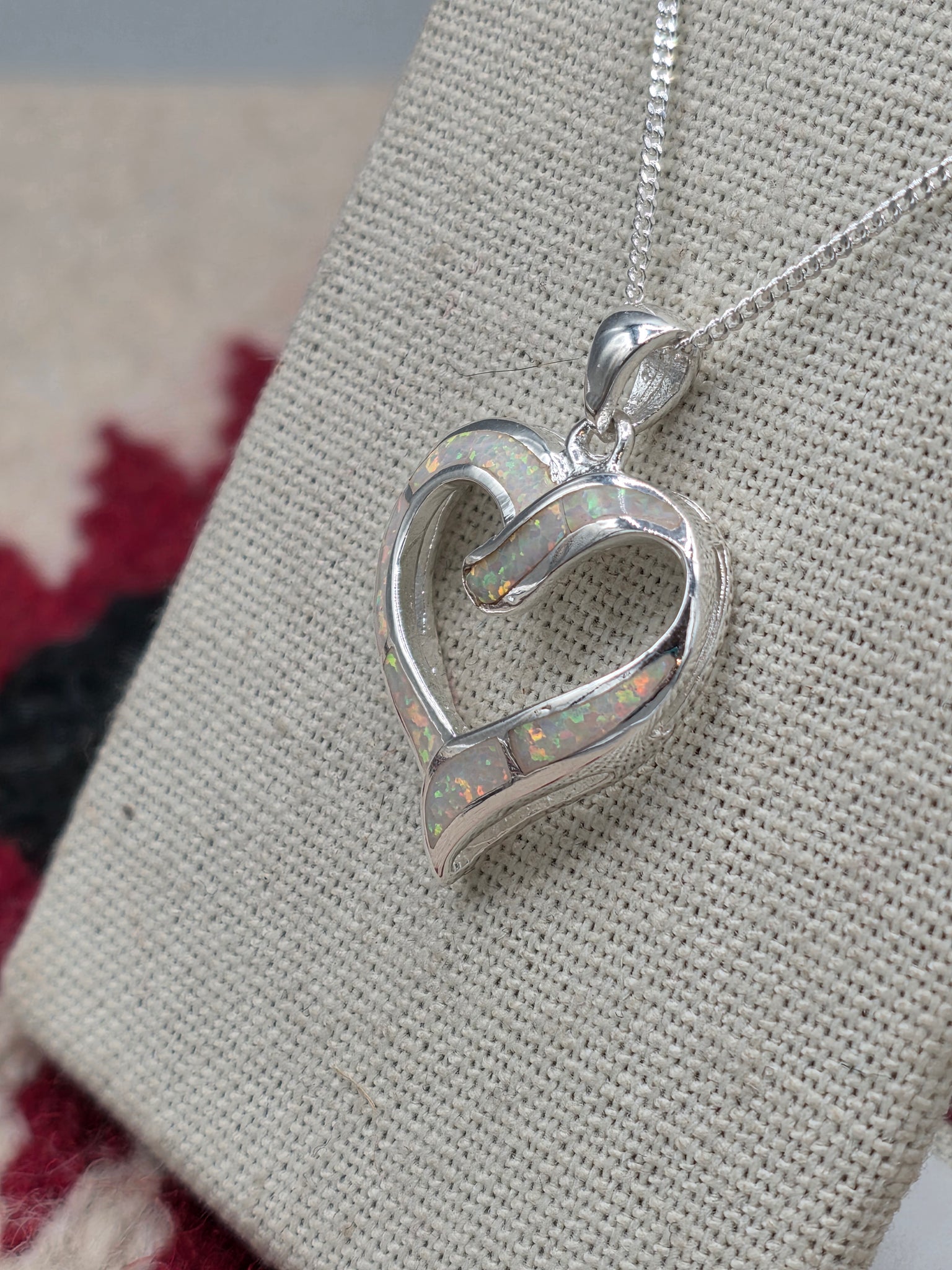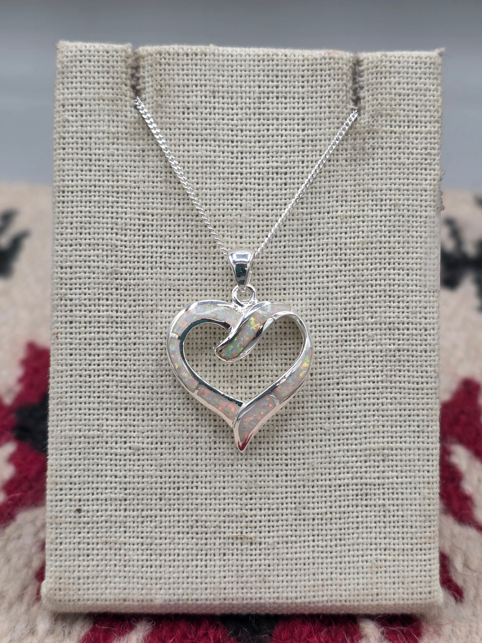 White Opal Inlay Heart Necklace set in Sterling Silver. Includes a #035 Curb Chain 20" long.