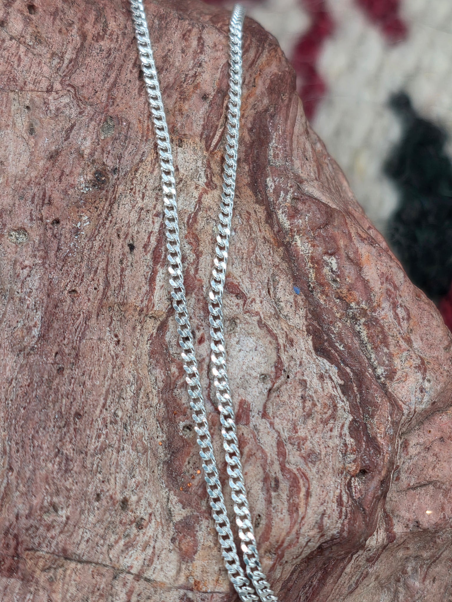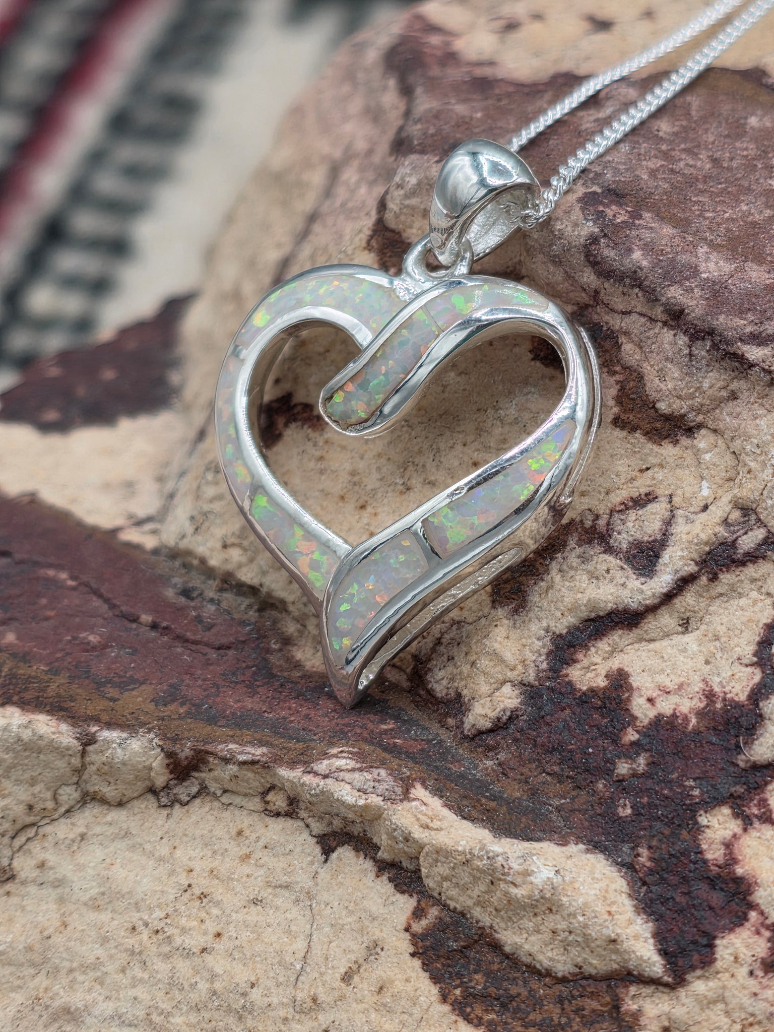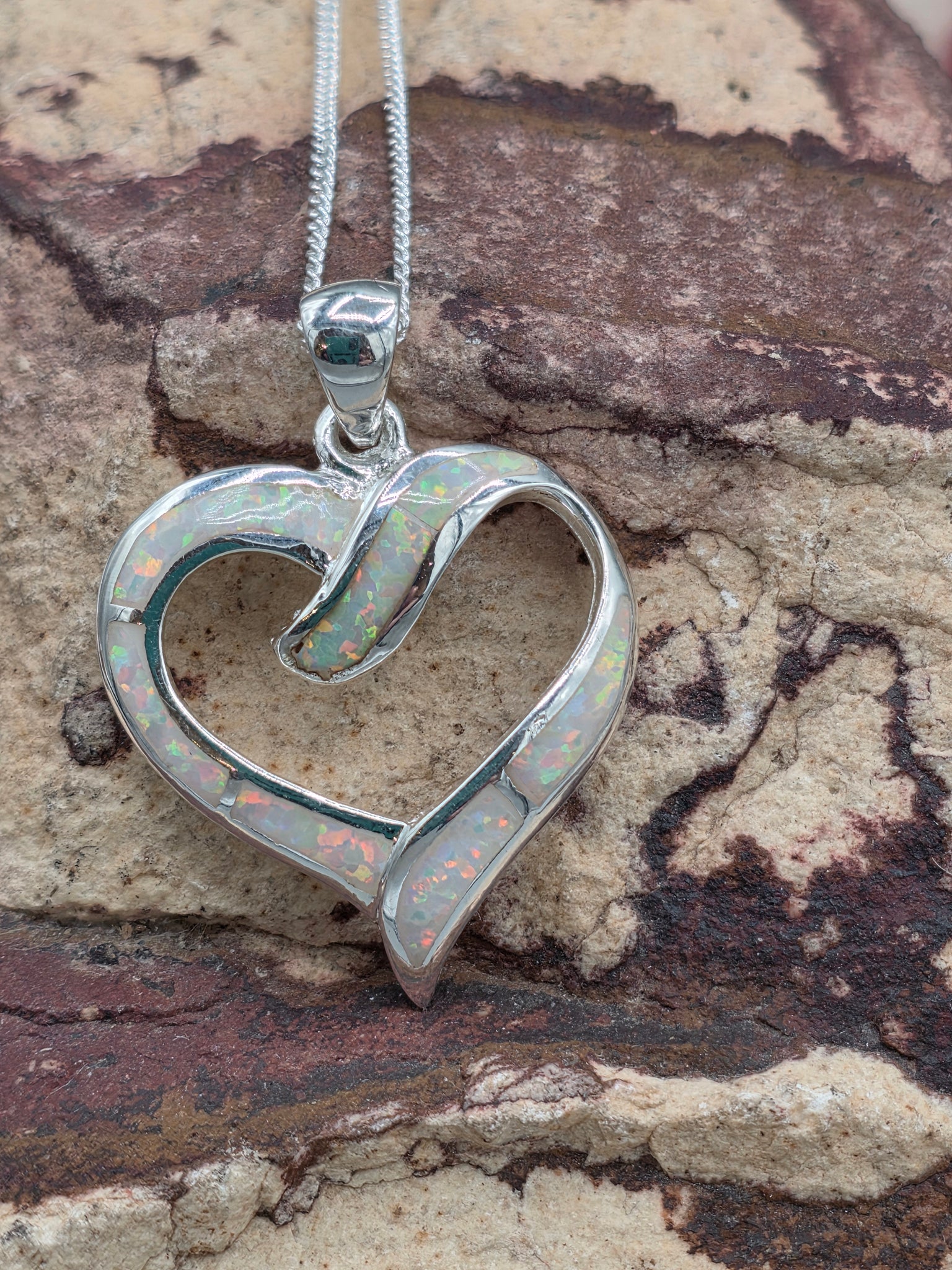 White Opal Inlay Heart Necklace set in Sterling Silver. Includes a #035 Curb Chain 20" long.