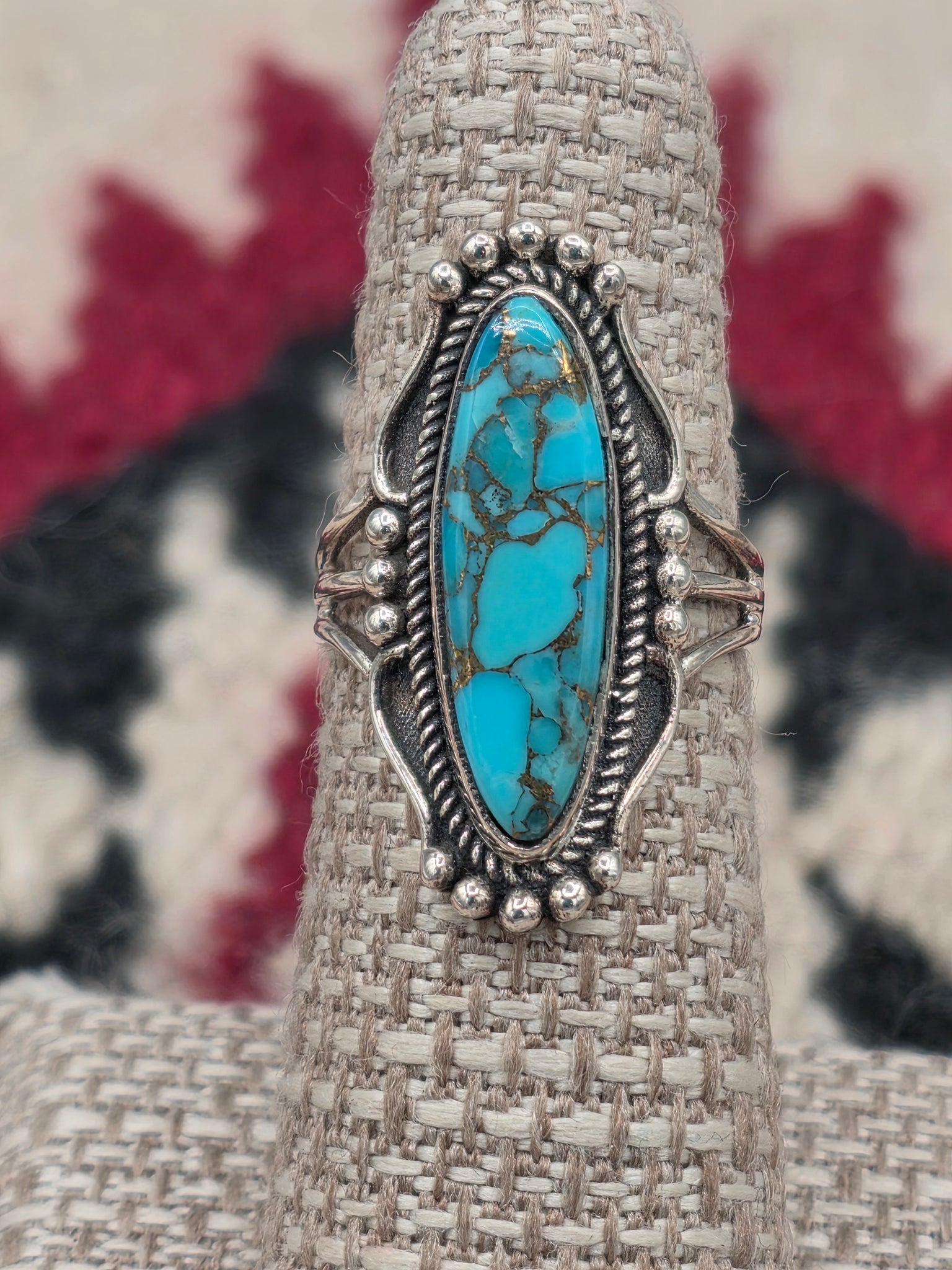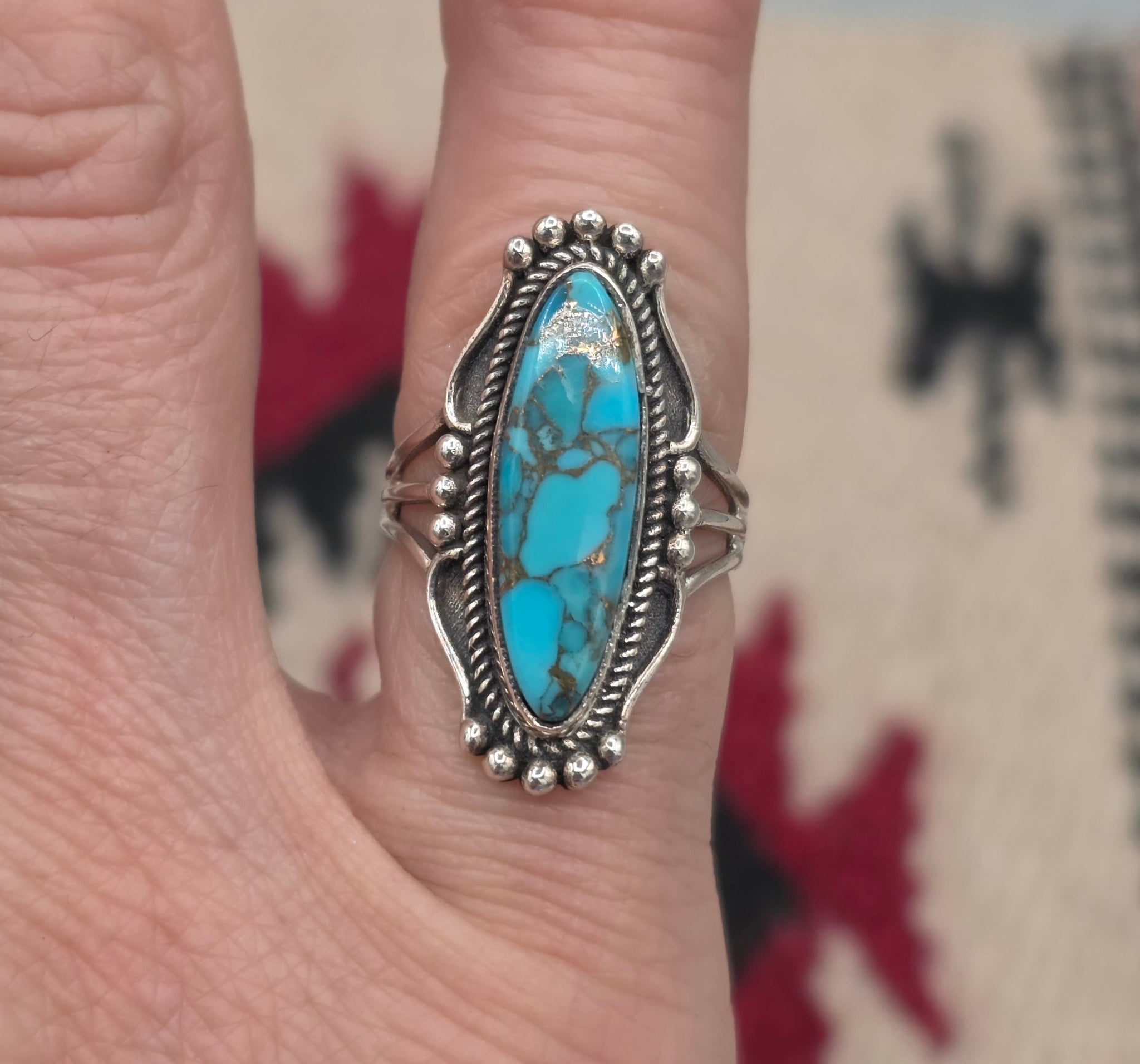 Turquoise Ring set in Sterling Silver with decorative edge.