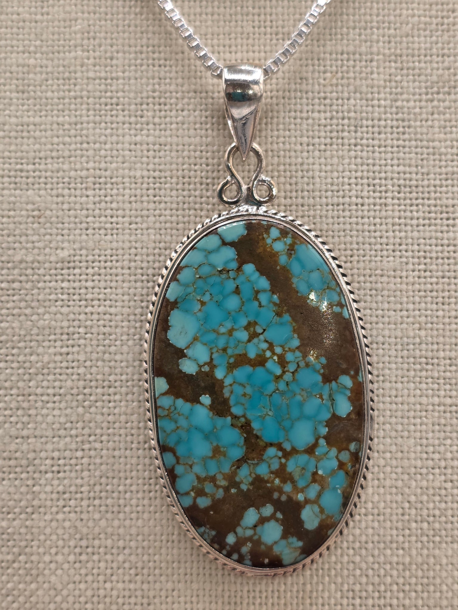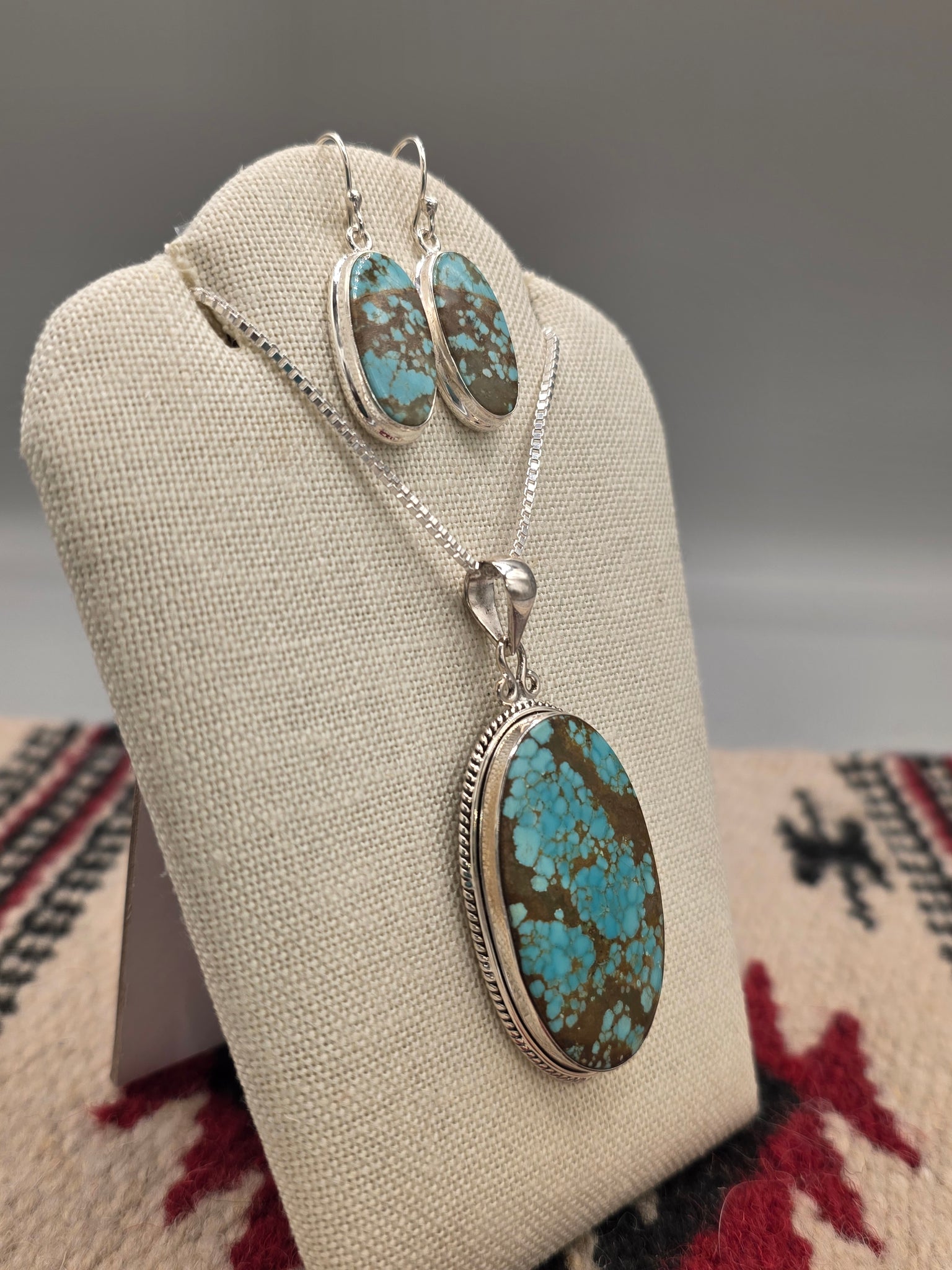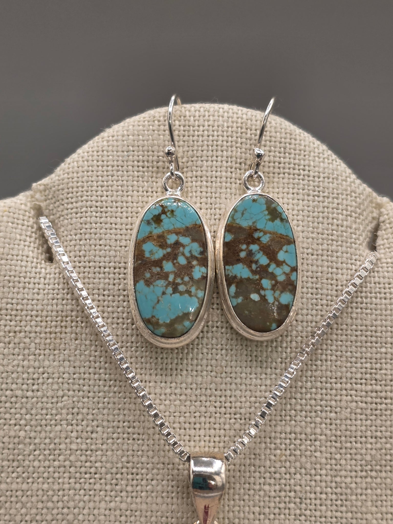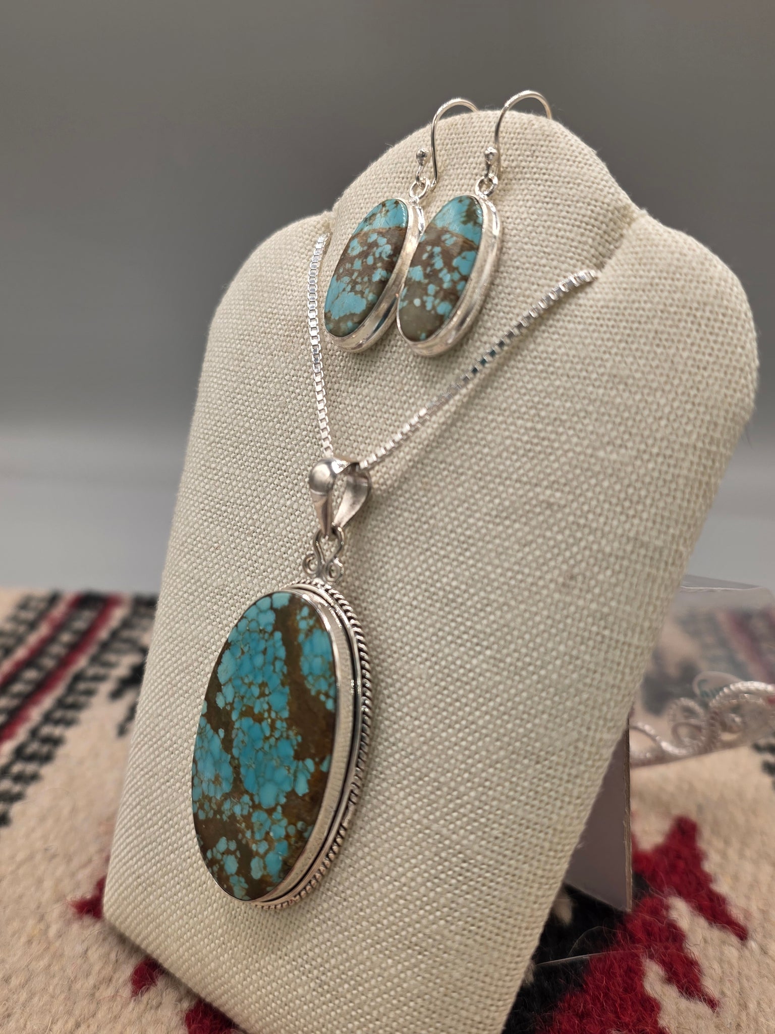 GORGEOUS #8 Turquoise Large Oval Pendant & Earrings Set in Sterling Silver. Pendant is approximately 60 mm long including bail. 26 mm wide. 5mm thick. Earrings are 40 mm long including French Hoops & 11 mm wide. Includes a Sterling Silver 24 " Adjustable Box Chain.