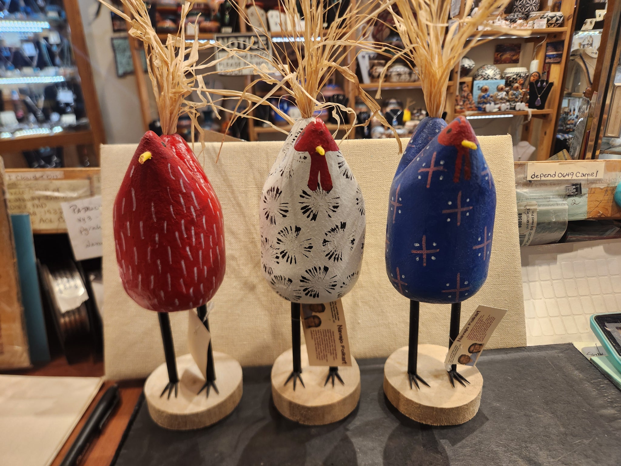 Handcrafted Navajo folkart expresses how the Navajo view their world and the people, animals & spirits in it. Colorful and whimsical, they are a great reminder of the culture that is the Dine`.